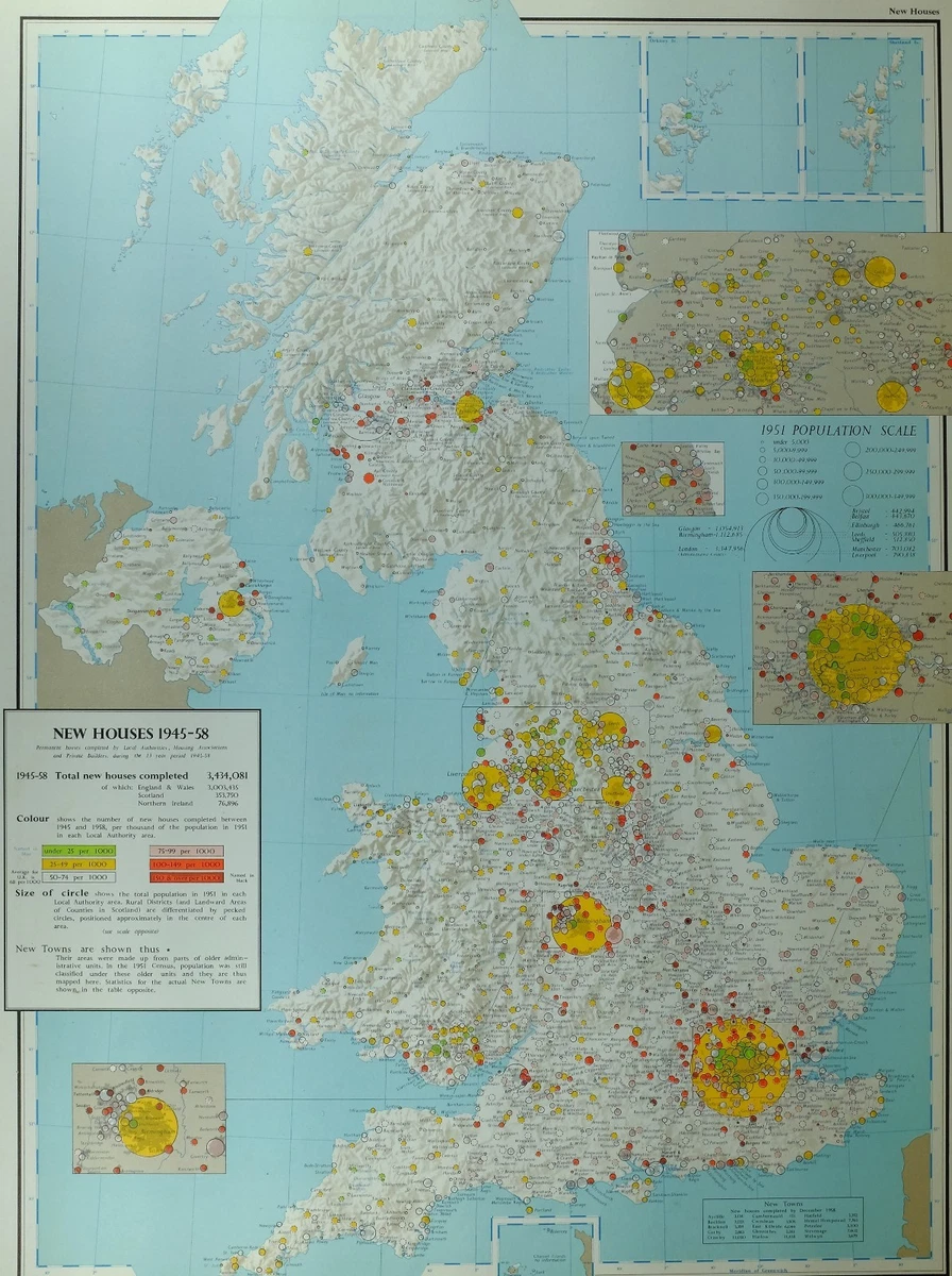 VINTAGE LARGE MAP of BRITAIN NEW HOUSES 1945 58 POPULATION