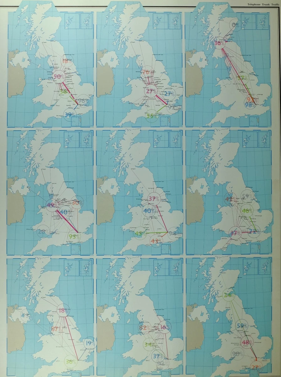 VINTAGE LARGE MAP of BRITAIN TELEPHONE TRUNK TRAFFIC LONDON