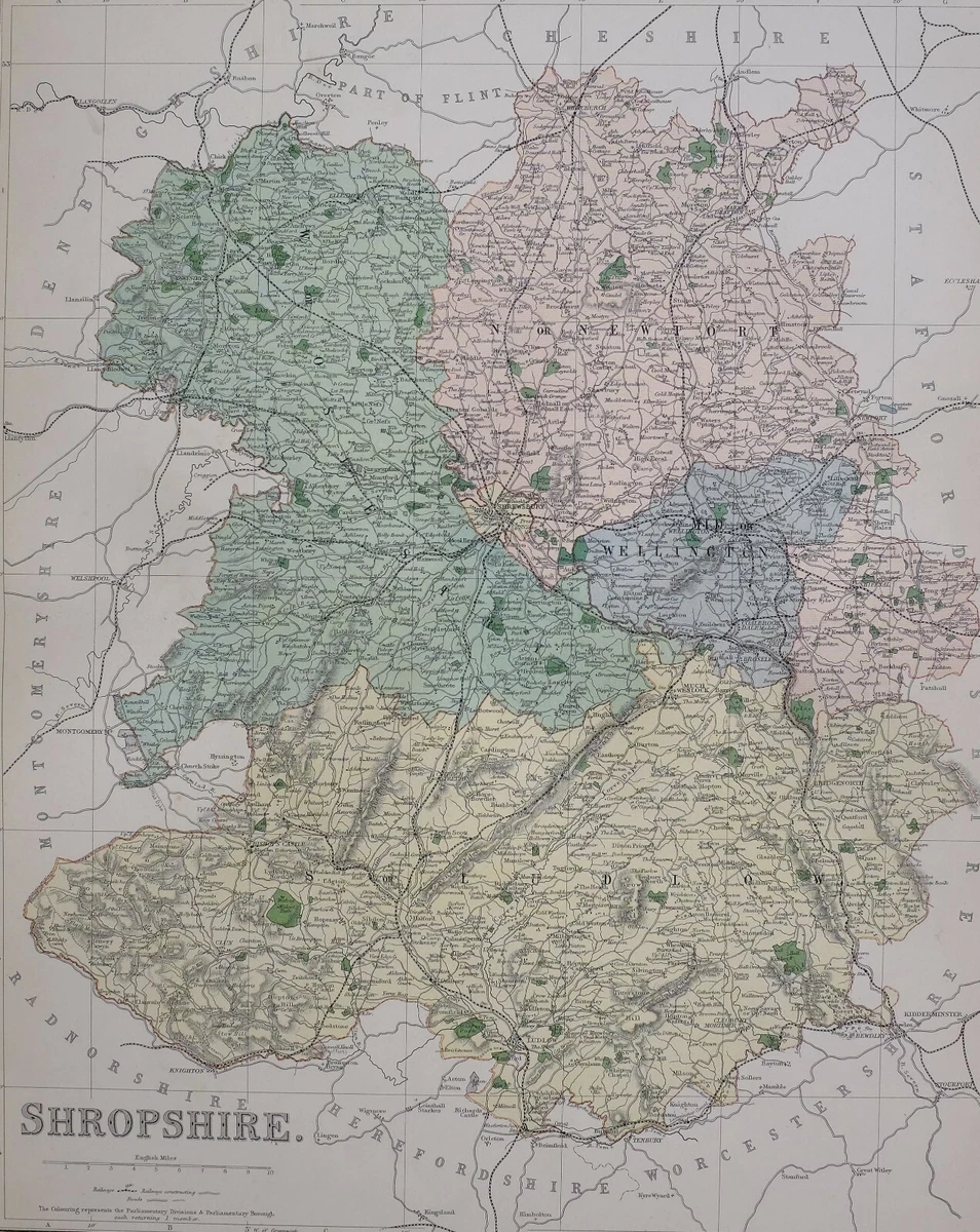 1889 COUNTY MAP SHROPSHIRE CLUN SHREWSBURY ELLESMERE WHITCHURCH