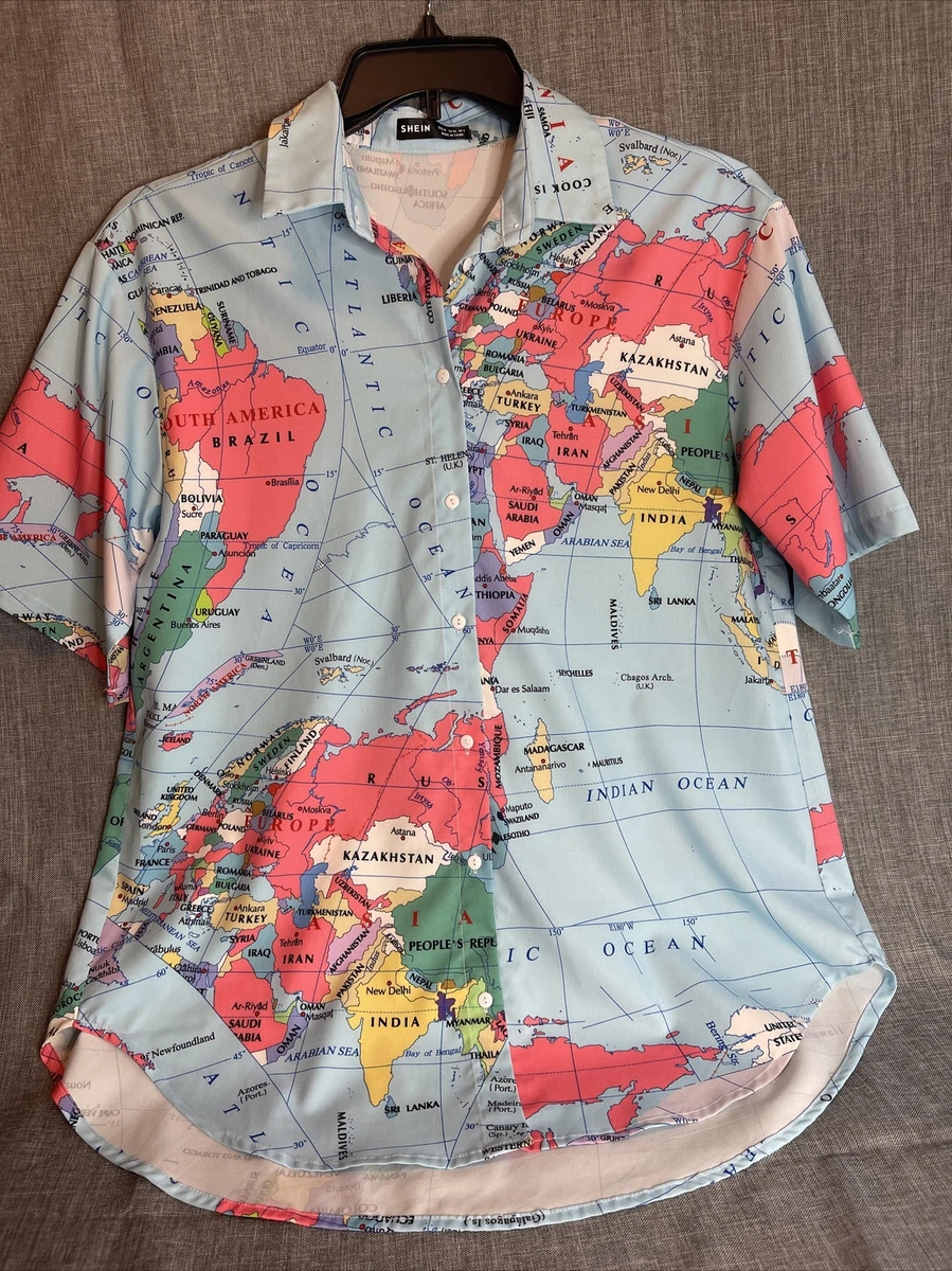 SHEIN Women’s M Casual Button Blouse Shirt World Globe Map Print